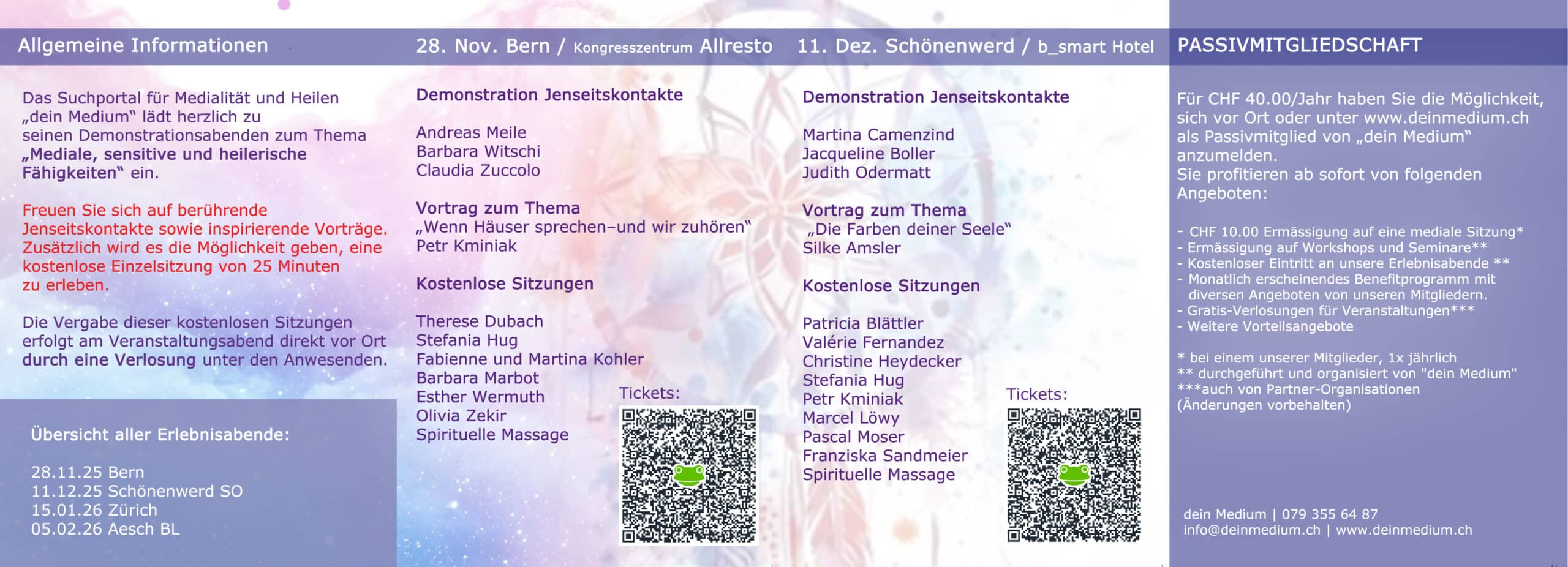 Türöffnung: 19.00 Uhr Begin: 19.30 Uhr Preis: CHF 36.00 Passivmitglider von "dein Medium" erhalten kostenlosen Eintritt. (Nur mit gültigem Mitgliederausweis) WICHTIG: Bitte kostenlosen Ticket im Vorverkauft herunterladen, nur so können wir einen Platz garantieren.