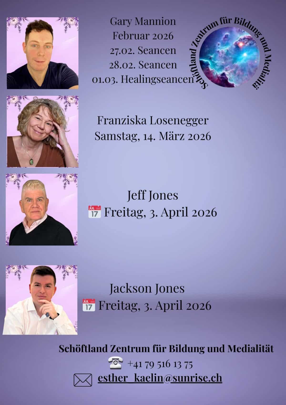 Wir freuen uns sehr, einige wunderbare Medien und Heiler begrüßen zu dürfen, darunter Gary Mannion, Jeff Jones, Jackson Jones und Franziska Losenegger.