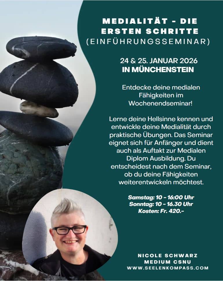 Im Einführungsseminar lernst du deine medialen und sensitiven Hellsinne kennen. Du lernst wie du deine und die Aura von anderen wahrnehmen und lesen kannst. Weiter lernst du deinen Geistführer kennen und wirst mit meiner Hilfe deinen ersten Jenseitskontakt selber herstellen können. Dieses Seminar kann zum „reinschnuppern“ ins Thema besucht werden oder als Start der Medialen Diplom Ausbildung.