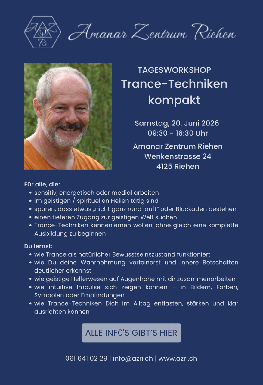 Dieser Tageskurs vermittelt Dir die Grundlagen der Trance-Arbeit, wie sie auch im Intuitiven Trance Healing nach Hampi van de Velde entwickelt und angewendet werden. Du lernst, wie Du Trance im Alltag und in Deiner energetischen Arbeit nutzen kannst – sanft, klar und ohne Überforderung.